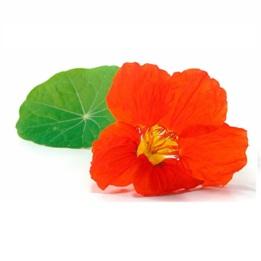 Ungefüllte Blüten in verschiedenen Gelb-, Orange- und Rottönen. Die Blätter und Blüten sind essbar - sie haben einen senfkresseartigen Geschmack und bilden eine hübsche, optische und kulinarische Bereicherung für jeden Salat. Am Fuß von Obstbäumen gepflanzt halten sie Blattläuse fern. Lockt Bienen an.